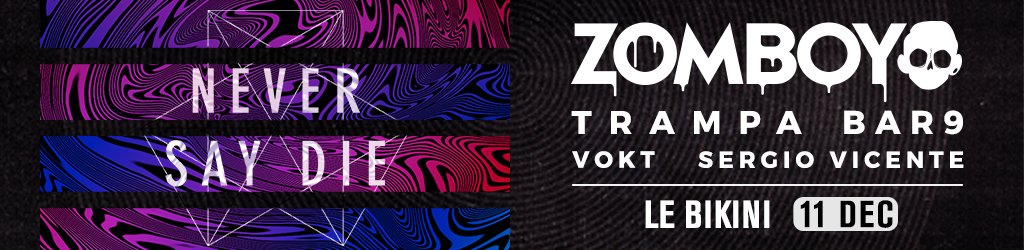 Plongez dans l’univers de l’incontournable label londonien NEVER SAY DIE ! Une soirée sous le signe du Dubstep et de la Bass Music avec au programme trois pointures internationales du label : Zomboy, Trampa et Bar9 !